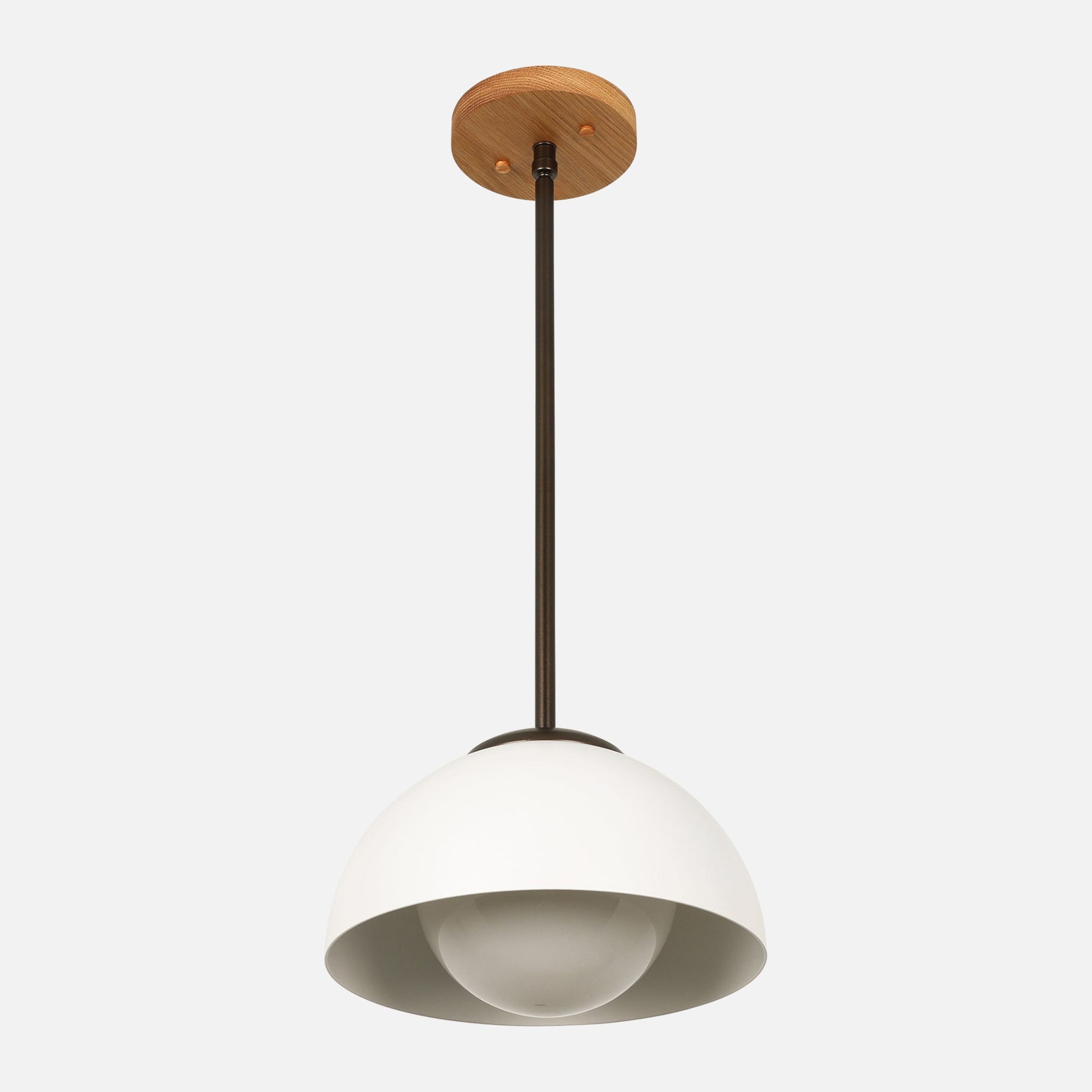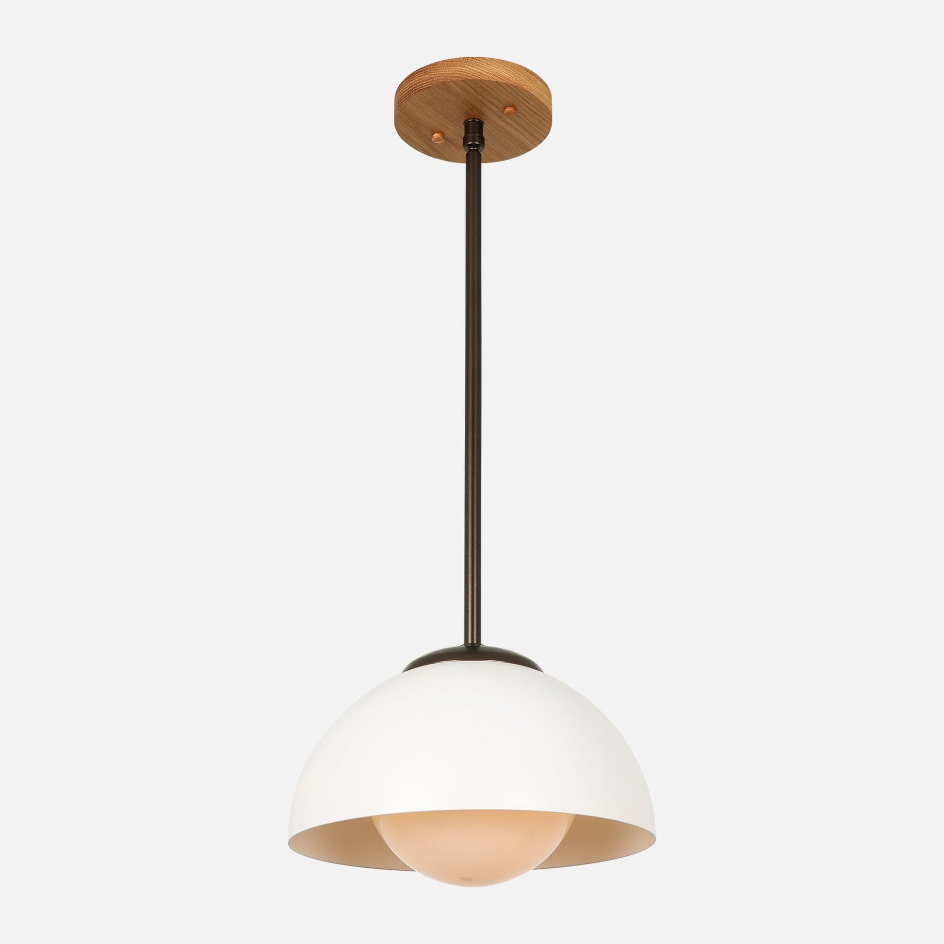 A dome shade and glass globe diffuser come together to form this mid-century inspired pendant light. Choose from our pallets of material combinations for an infinitely versatile look and feel. The Protea II collection is the next iteration of our classic Portea lights and use easy to install screw on glass globes.